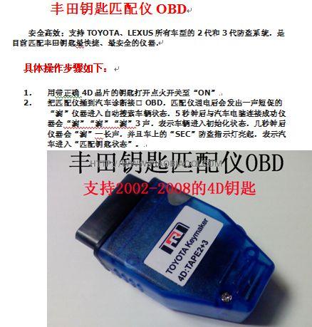 豐田OBD鑰匙匹配儀,無需連接任何電腦,增加一把鑰匙只需20秒左右,支持所有豐田4D 60、63、67晶片和智能鑰匙的防盜系統, 支持K線和CANBUS協議,是目前匹配豐田、凌志車型鑰匙全丟的最快捷的儀器。