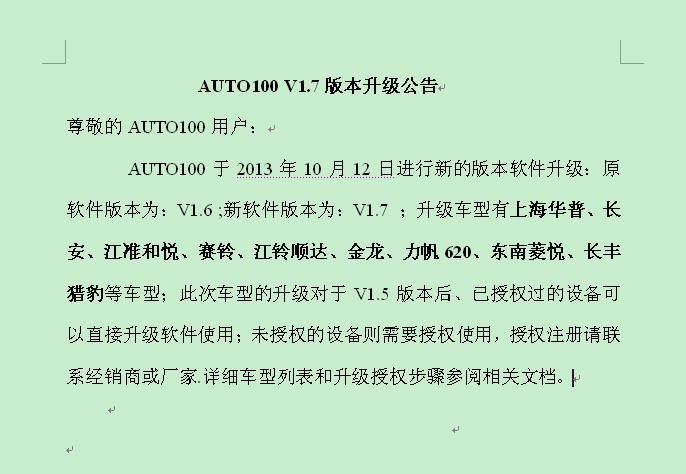 強版本升級公告 尊敬的AUTO100用戶: AUTO100于2014年3月17日進行增升車型/表號數據:軟件版本仍為:V1.8 ;增升車型有東南希旺、吉利熊貓/自由艦、長安之星、江準瑞風、福田奧鈴、黃海、奇瑞優雅、五菱、富迪等車型;此次車型的升級對于V1.5版本后、已授權過的設備可以直接單個數據使用(操作見說明);未授權的設備則需要授權使用。 注: 1、本次升級車型不需重新安裝軟件,具體操作請參照數據包中的《單個數據寫入說明》。 2、程序數據包下載地址: http://www.carcarcar.cn/download.asp(或聯系業務員索取數據包)。 3、授權注冊請聯系經銷商或廠家.詳細車型列表和升級授權步驟參閱相關文檔。