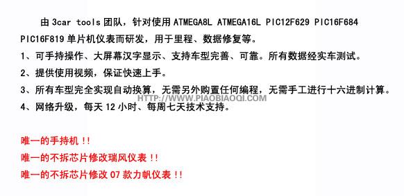AUTO100 升級優惠活動(V1.5.1版本) 尊敬的AUTO100用戶: AUTO100于2013年7月20日進行新的版本軟件升級:原軟件版本為:V1.2 ;新軟件版本為:V1.5.1.為完善AUTO100車型儀表調校類型,公司將市面常見、保有量較大的ATMEGA169P車型儀表進行解密升級(升級共50款);為升級方便本次采用一次性付費授權升級方式、針對新老客戶優惠升級、升級費用為:800元,優惠時間:2013年7月20日到2013年8月31日;優惠期結束將按公司制定升級標準執行。由于單片機解密和升級需投入費用,望新老客戶的理解與支持。詳細車型列表和升級授權步驟參閱相關文檔說明。