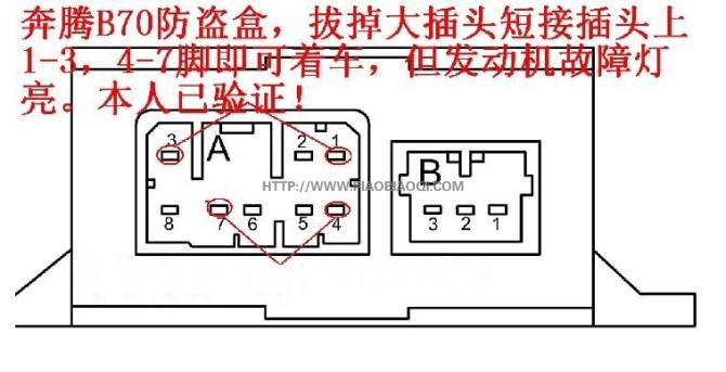 短接防盜盒1-3,和4-7腳,和3-5,1-4腳即可應急解除防盜,兩種方法到底那個正確。有很多人有爭議,本人剛開始也有爭議,但是仔細的看過電路圖后明白了,兩種方法都可用,兩種方法區別就在于1腳和5腳,看電路圖你將會明白1號角是蓄電池長電,而5號角是開關過來的電,也就是說給3號角一個12V電,就行得通,本人成功短接過1-3,4-7腳,車子可以啟動的。下面有圖看了你就會明白了,至于這個方法適用于什么車型,只針對新款帶防盜盒子的車.